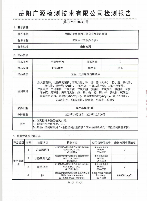 2025年10月岳阳市水务集团管网水水质检测月报表