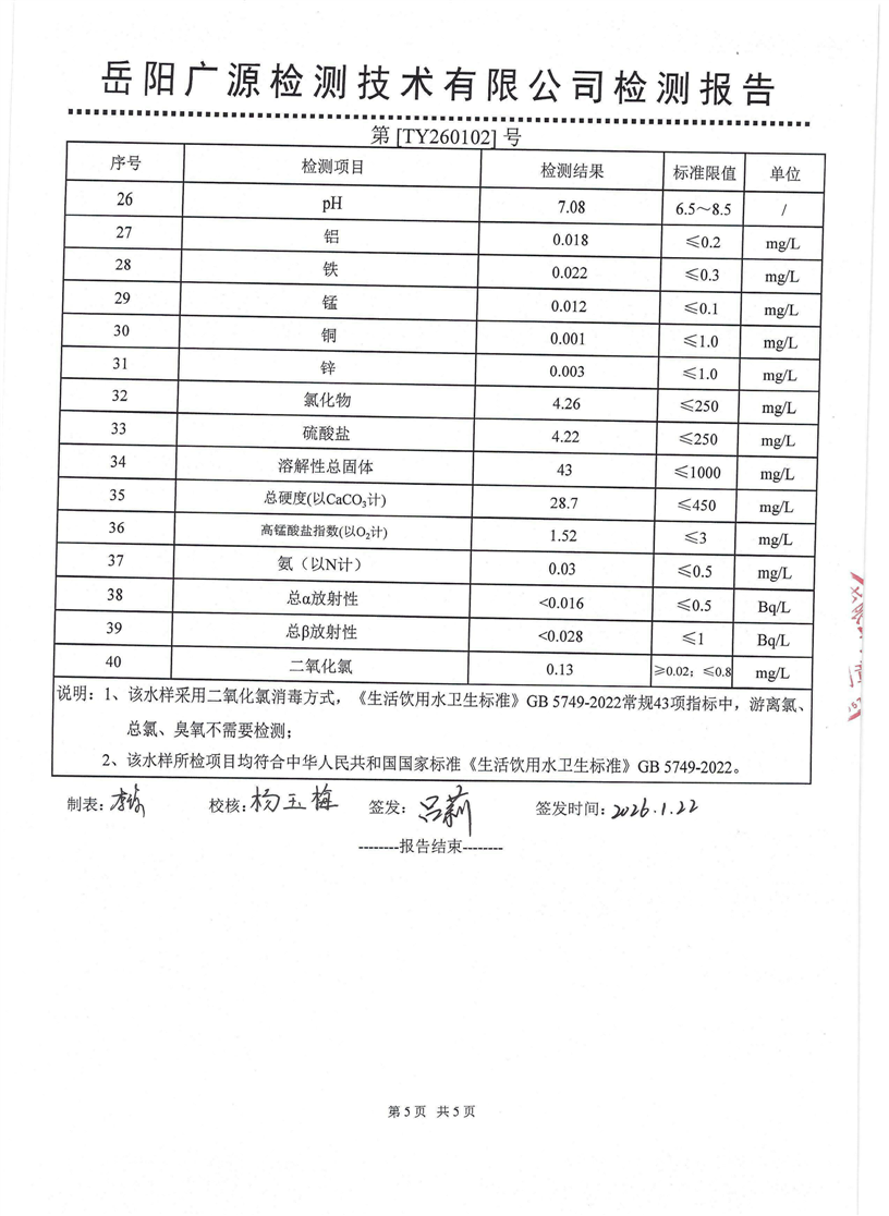 2026年1月岳阳市水务集团管网水水质检测月报表