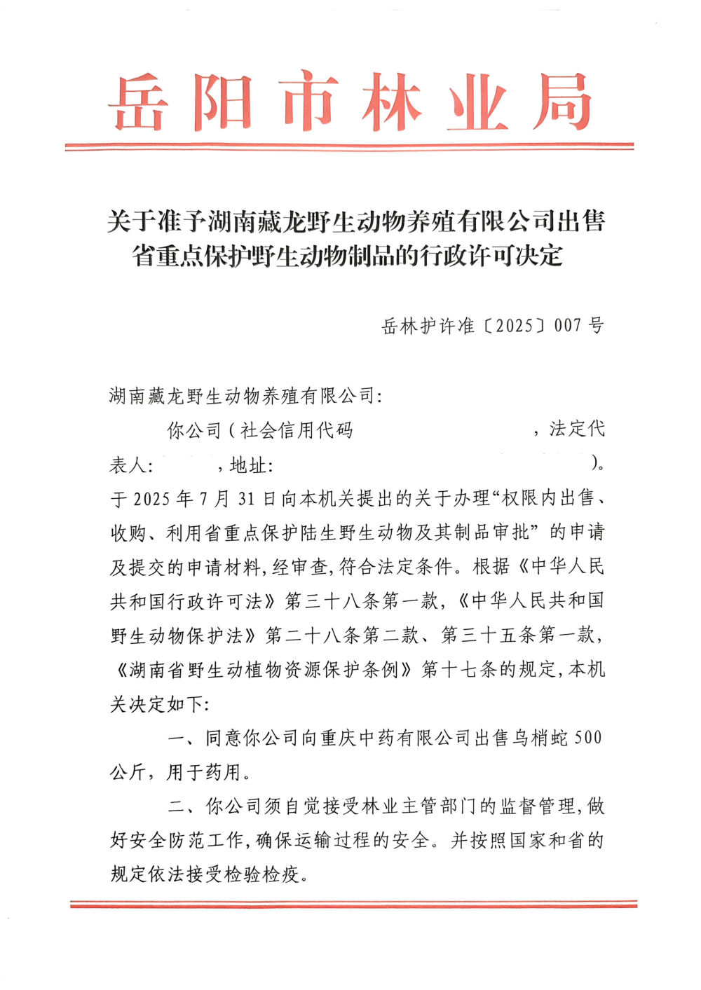 关于准予湖南藏龙野生动物养殖有限公司出售省重点保护野生动物制品的行政许可决定 岳林护许准〔2025〕007号