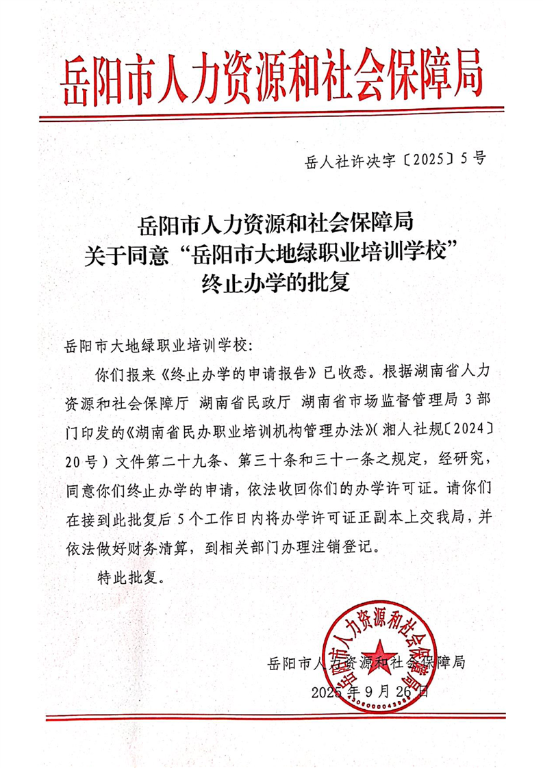 关于同意“岳阳市大地绿职业培训学校”终止办学的批复