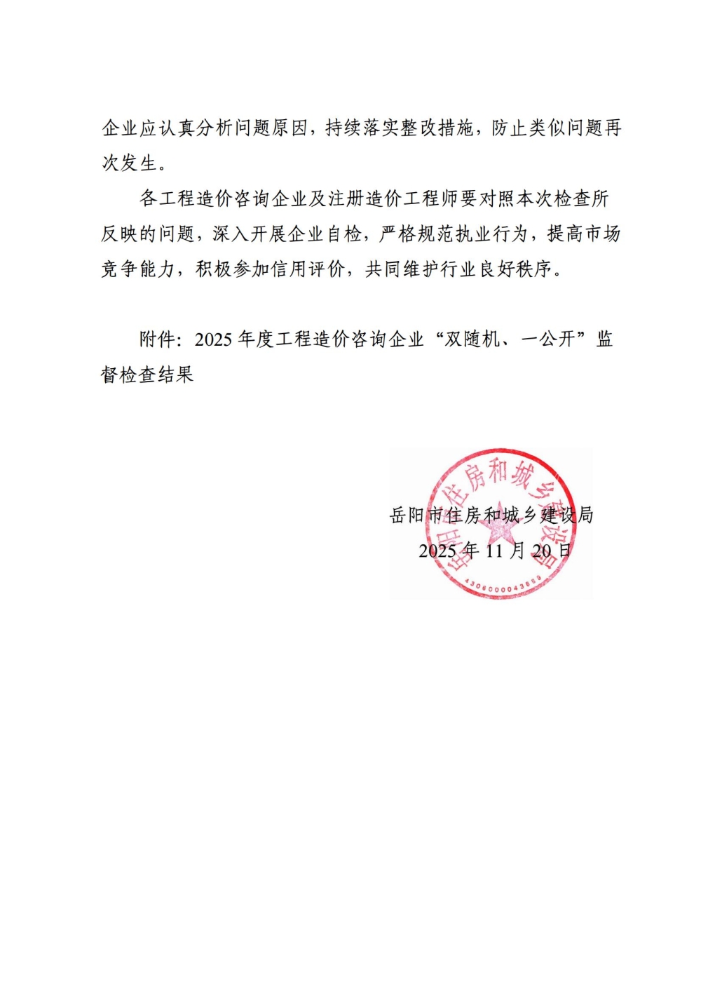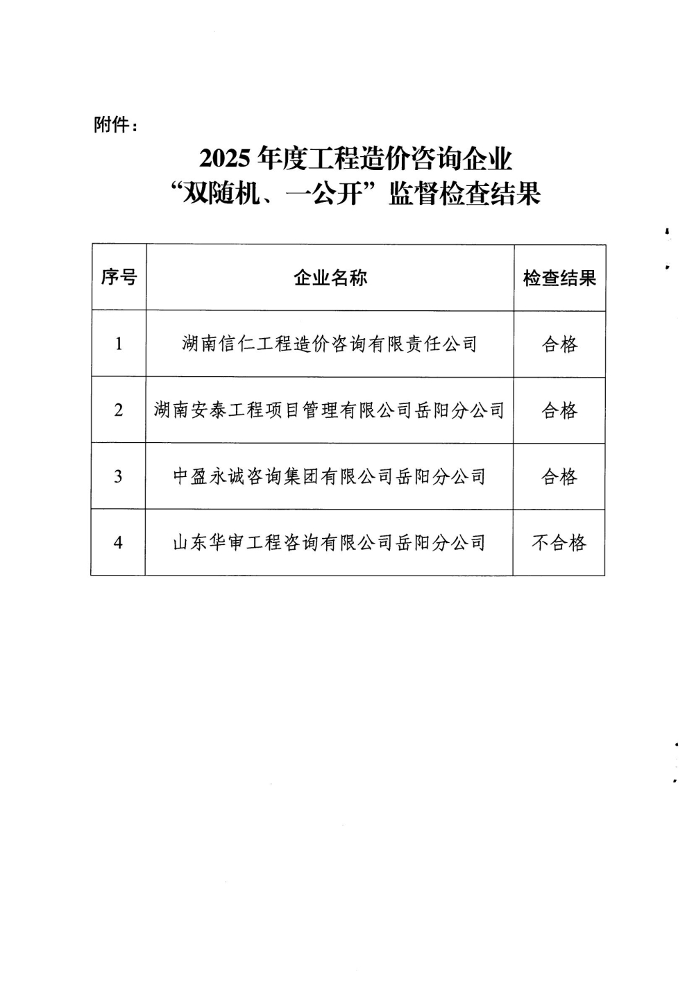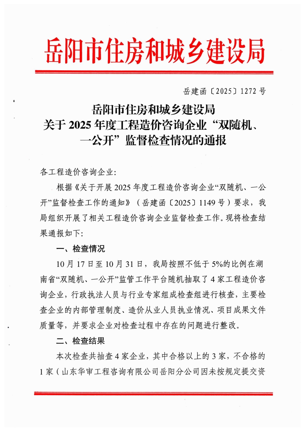 关于2025年度工程造价咨询企业“双随机、一公开”监督检查情况的通报