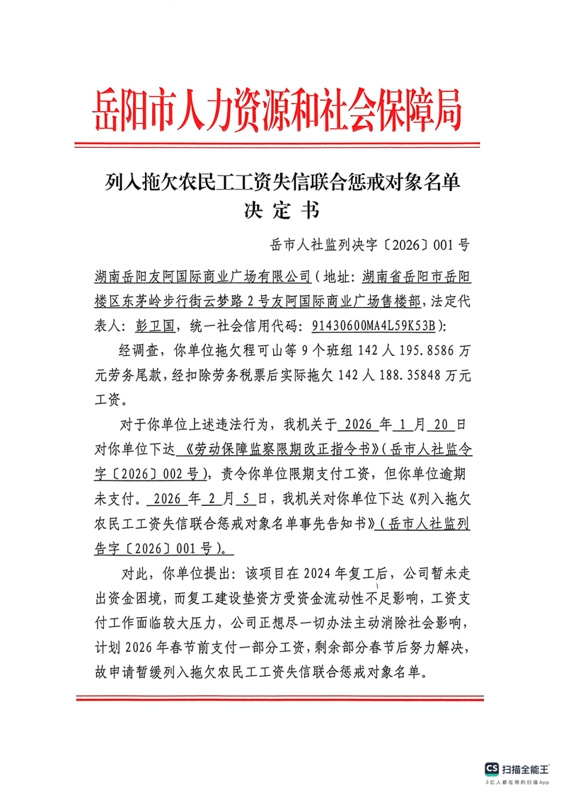 湖南岳阳友阿国际商业广场有限公司《列入拖欠农民工工资失信联合惩戒对象名单决定书》
