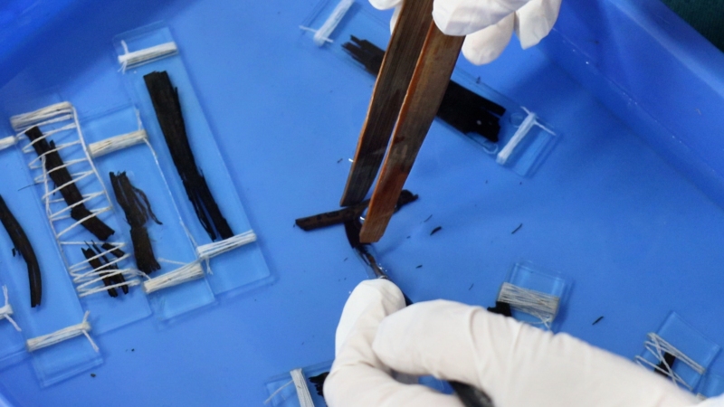 显微镜是修复师的“好助手”。他们用显微镜观察纤维,判断含水量、材质变化、微生物附着情况,在特制溶液中进行消毒,再用毫针调整形态。